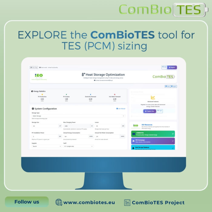 The ComBioTES project is pleased to announce the launch of a new tool developed by IEO, designed to support PV installers and prosumers looking to enhance their systems with a thermal energy storage (TES) solution.